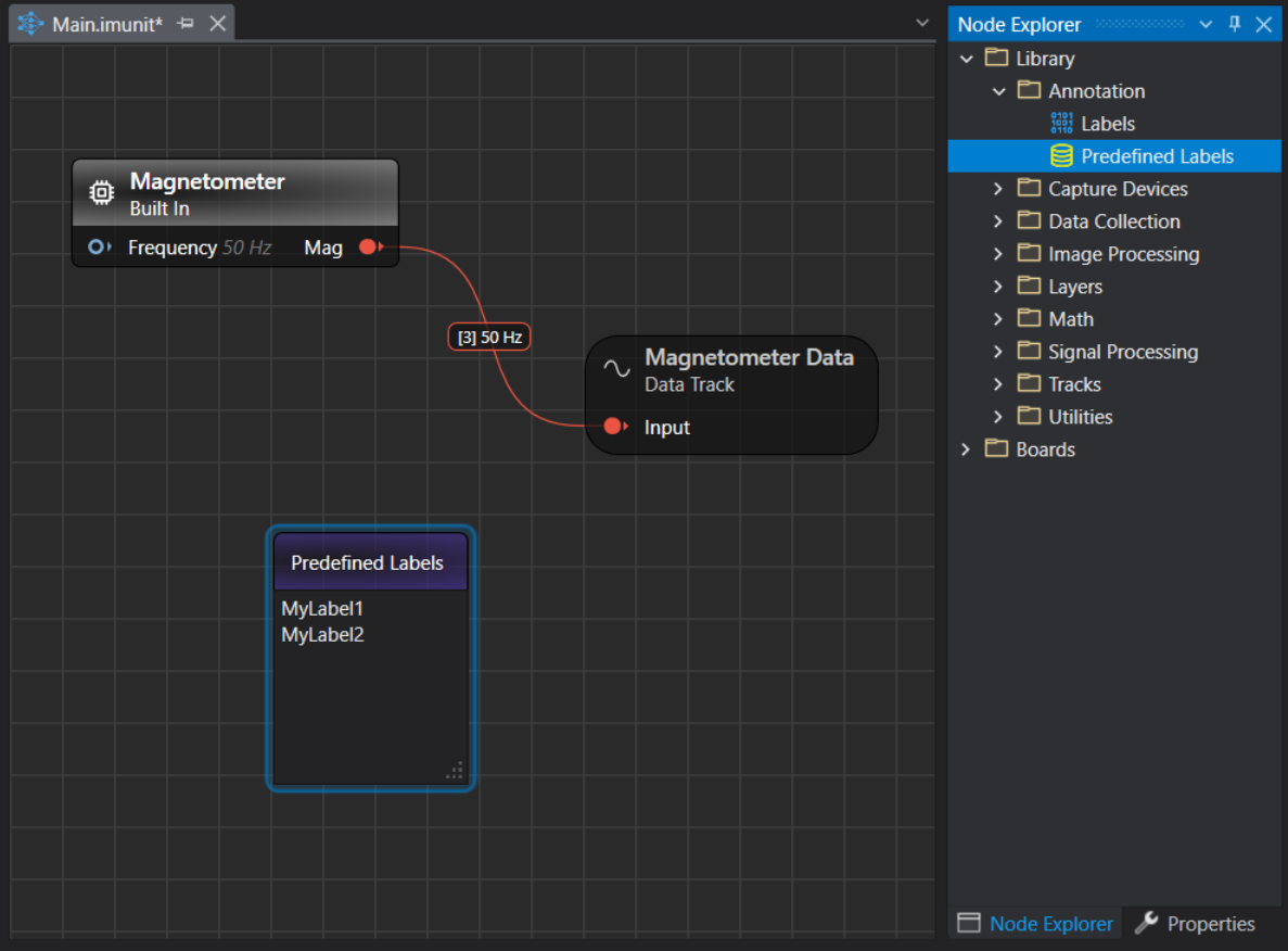 After setting up the Magnetometer sensor node, you can utilize the same graph to label the real-time data, by adding a Predefined Labels unit onto the canvas. Define the classes in the Predefined Labels node for one time and utilize the defined classes to label the data on a click of button.