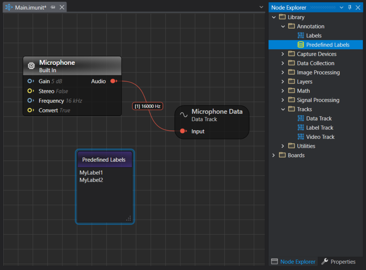 After setting up the Microphone sensor node, you can utilize the same graph to label the real-time data, by adding a Predefined Labels unit onto the canvas. Define the classes in the Predefined Labels node for one time and utilize the defined classes to label the data on a click of button.