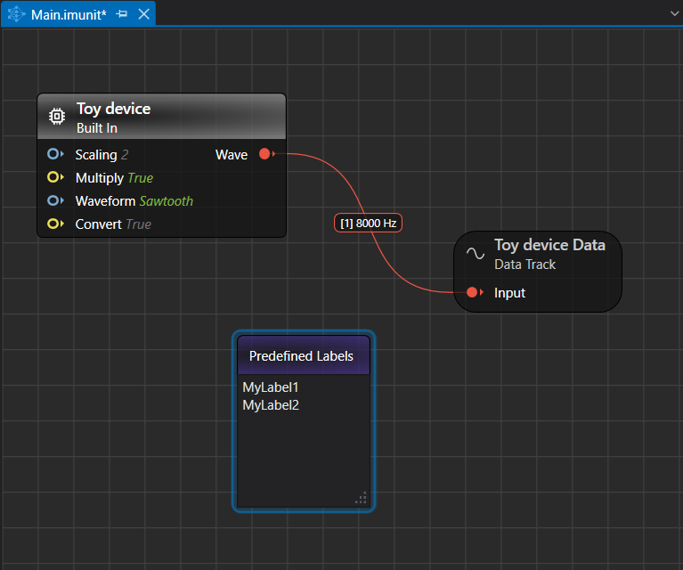 After setting up the Toy device node, you can utilize the same graph to label the real-time data, by adding a Predefined Labels unit onto the canvas. Define the classes in the Predefined Labels node for one time and utilize the defined classes to label the data on a click of button.
