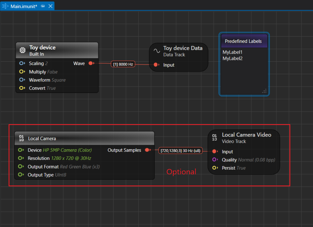 - Connect the Output of the Local Camera Node to the Input of the Video Track by clicking on the red icon in the Local Camera node and dragging over to the red icon in the Video Track. This creates a connection between the two nodes.