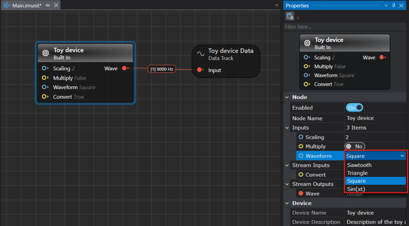 Click on the Toy device sensor node to edit the settings in the Properties window, if required. For instance, you can select Waveform: Sawtooth, Triangle, Square, Sin(xt). Similarly, for your sensor configure the settings, as needed.