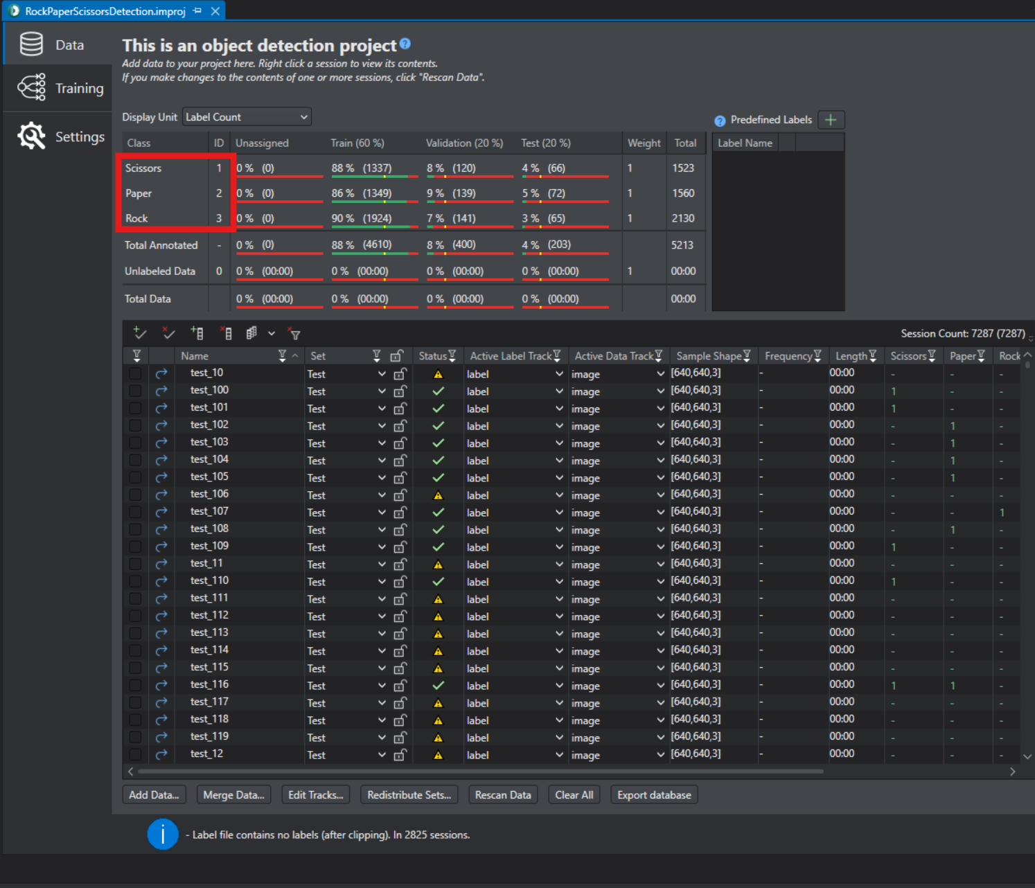 If you have trained the model in Studio, make sure the order of the classes in the class list string matches the order in your DEEPCRAFT™ Studio project. To see the order of the classes in Studio, open the project file(.improj) and select the Data tab.